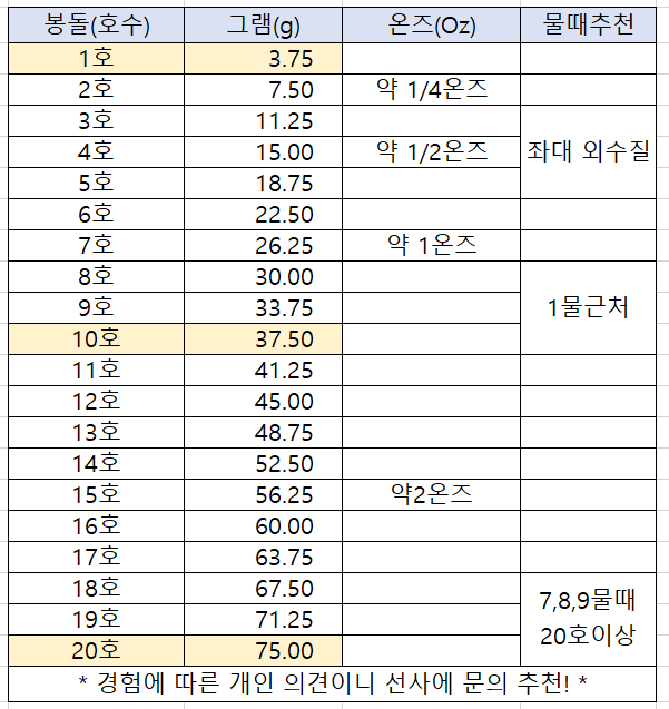 봉돌 / 그램 / 온즈 / 비교표, 물때에 따른 봉돌